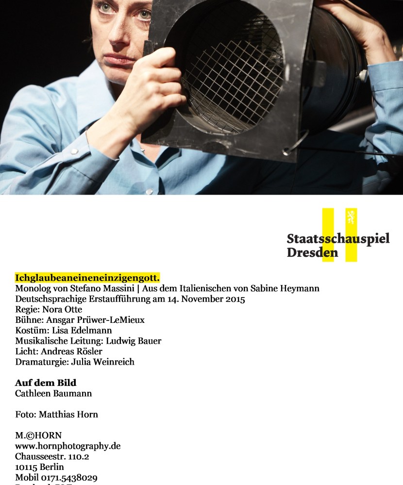 „Ichglaubeaneineneinzigengott.“, Monolog von Stefano Massini, deutschsprachige Erstaufführung in der Regie von Nora Otte am Staatsschauspiel Dresden, 14. November 2015